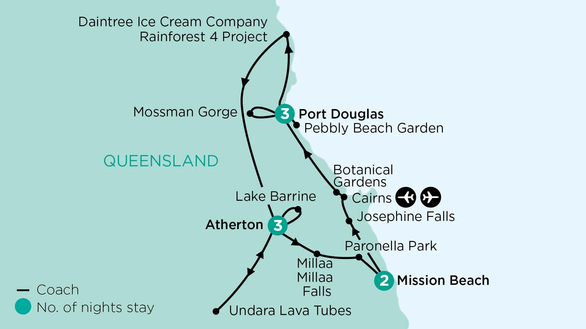 We leave the coast and head inland to the Atherton Tablelands, a highland region with a mix of rainforest, wetlands and savanna. The area is also home to numerous birds and wildlife species. In the town of Mareeba, we pay a visit to the Golden Drop Winery Mango Farm. Take a tour of the Mango Farm and enter their packing shed to learn all about mango wine production. Next, we visit Jaques Coffee Plantation, where we see its production plant. Afterwards, venture to a local private garden before arriving at our hotel.