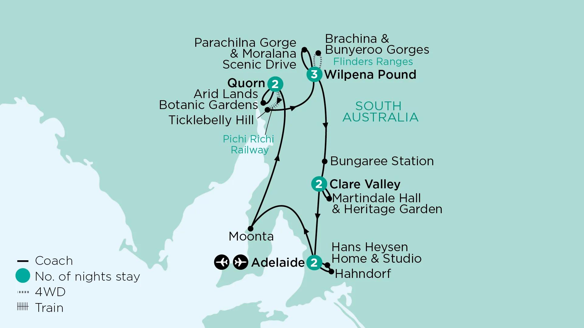 Today we visit the Australian Arid Lands Botanic Gardens, home to thousands of highly evolved plant species which have adapted to thrive in an environment of extreme temperatures and frequent droughts. Enjoy touring the garden before visiting the Wadlata Outback Centre to see the ‘Tunnel of Time’, an interactive introduction to the Flinders Ranges, from the dinosaur era to today. Tonight we visit the Silo Light Show in Quorn, a spectacular audio-visual display celebrating the stories of the Flinders Ranges.