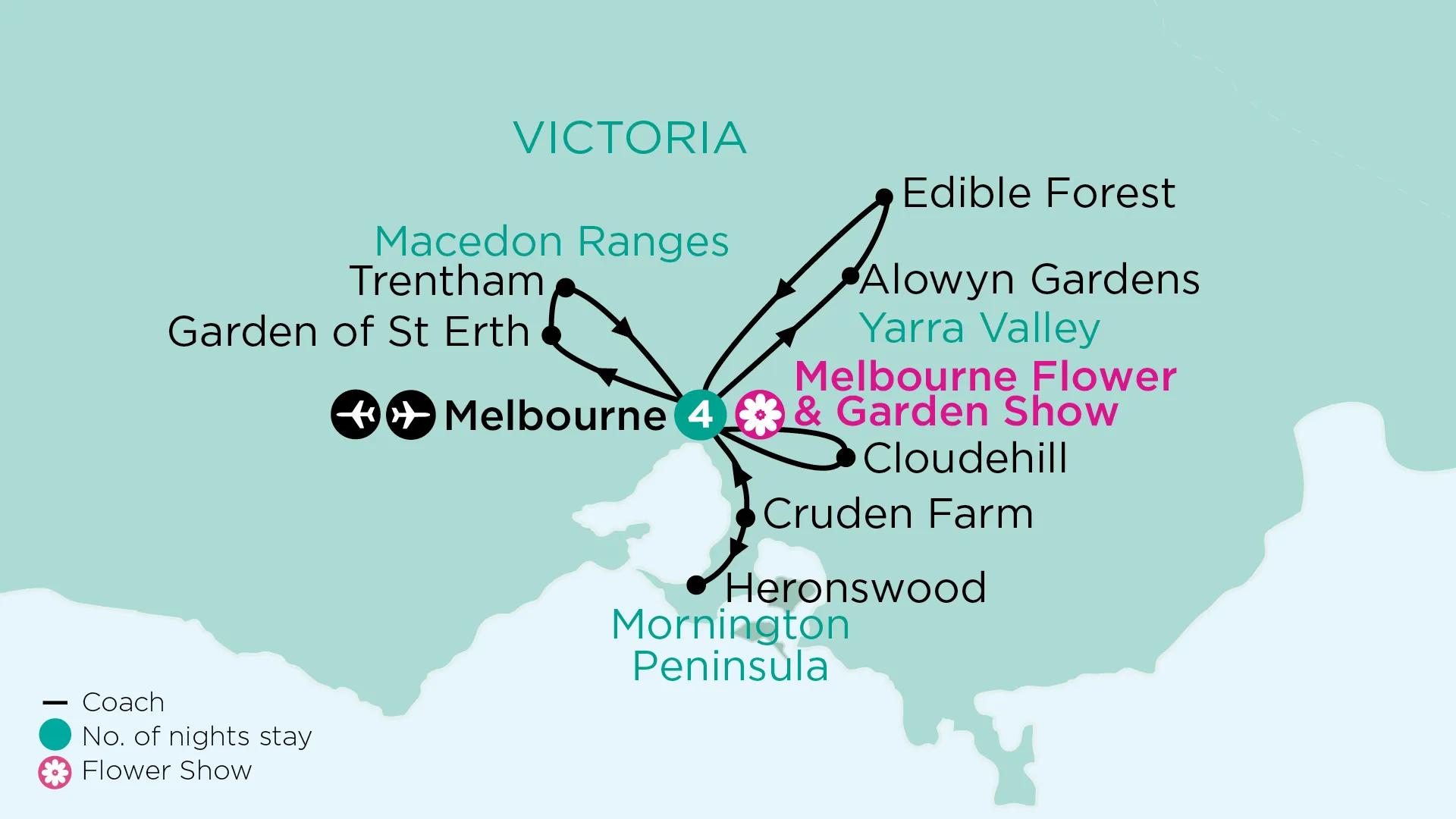 Travel to Kinglake to visit Antique Perennials nursery and display garden, where you’ll see hard-to-find perennials, bulbs, grasses and alpines. Afterwards, we make our way to the Edible Forest in the Yarra Valley. With more than 300 plants growing within a one-acre forest garden, everything is either edible or medicinal. Enjoy lunch here before continuing to Coombe Farm for a guided tour of Dame Nellie Melba’s breathtaking garden, set on seven acres, beautifully designed by William Guilfoyle. The garden’s most striking feature is the towering grand cypress hedge, planted in 1909, which adds an air of grandeur to this historic estate. During dinner tonight, enjoy a special Melbourne Flower Show lecture by regular judge Teena Crawford.