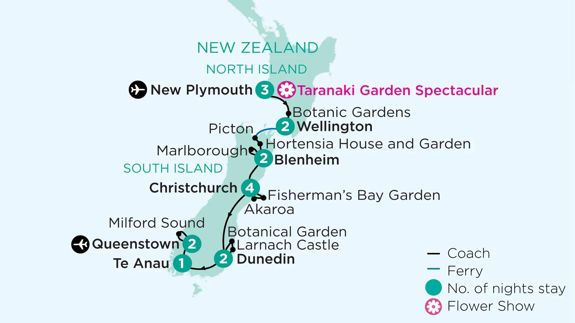 Today you’ll enjoy one of the world’s most scenic voyages as the Interislander ferry traverses Cook Strait, past the breathtaking landscapes of Marlborough and Queen Charlotte Sounds. Weave through unspoilt islands and admire stunning coastlines punctuated by a series of tiny coves as we approach the South Island and the town of Picton. After a short drive, we visit Longfield garden, where we will enjoy lunch. Afterwards explore the renowned cottage-style Hortensia House with its Monet-inspired hydrangea garden.