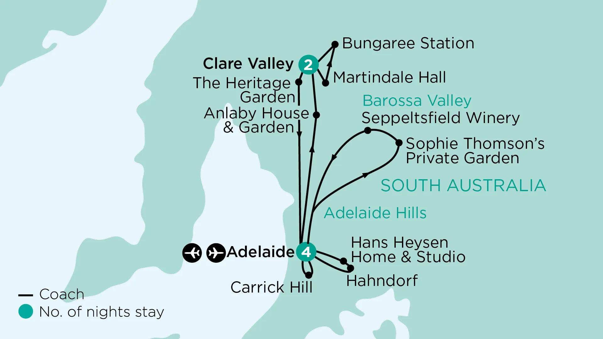 This morning, visit the most famous garden in the Clare Valley, The Heritage Garden. Kay Duncan and her late husband Walter worked hard to create and maintain this lush six-acre private country garden, which includes 2,000 rose bushes. Travel back to Adelaide this afternoon, where your tour concludes at The Playford Hotel at around 2.30 pm.