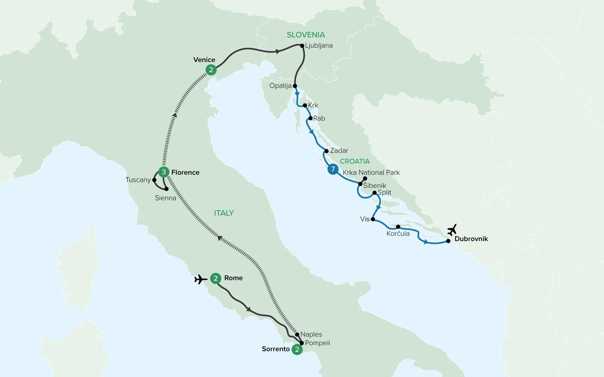 After breakfast, travel via Slovenia’s vibrant capital, Ljubljana, to Opatija, where you’ll board your ship and settle in for an unforgettable seven-night Adriatic cruise.