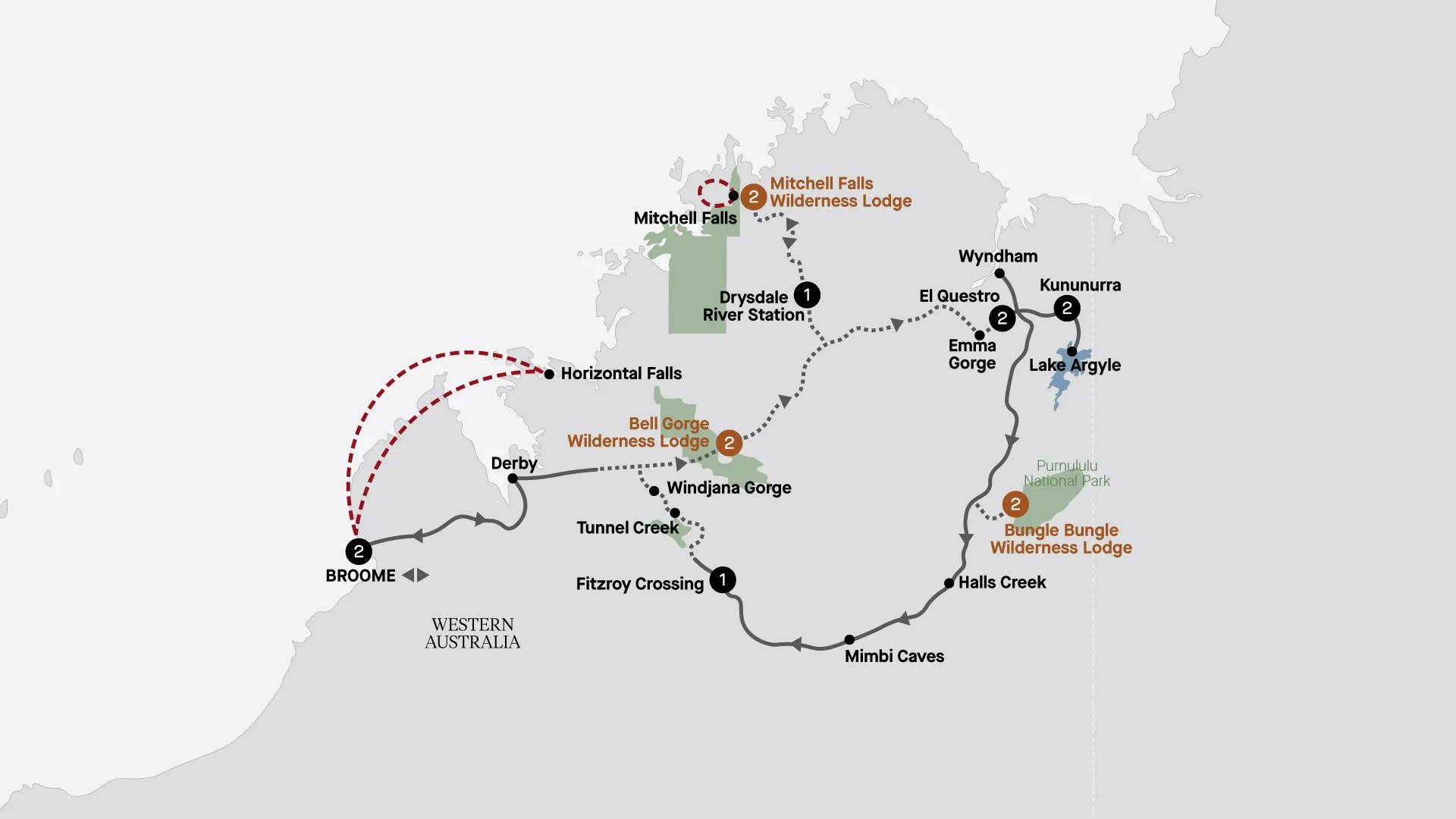 Your day starts with a visit to the fascinating Boab Prison Tree. Believed to be more than 1,500 years old and measuring an incredible 14 metres in diameter, this remarkable tree was once used by early police patrols as a standing point for prisoners as they were walked to Derby. Today, the hollow tree is a registered Aboriginal site of great cultural significance. Continue your journey along the iconic Gibb River Road, a remote 660-kilometre outback highway stretching between Broome and Kununurra. The ‘Gibb’ traverses the wild heart of the Kimberley, passing spectacular landscapes of intensely coloured ranges, dramatic gorges, deep rock pools and spectacular waterfalls. Turn off the Gibb River Road to the extraordinary Tunnel Creek, a 750-metre-long natural tunnel carved through the Napier Range. With torch in hand, wade through the cool waters that fill the tunnel and emerge on the other side to the sight of a tranquil and stunning oasis. Continue on to Windjana Gorge, where sheer cliffs tower above glistening white sands. Admire the ancient marine fossils embedded in the gorge walls and scour the banks for a glimpse of the freshwater crocodiles. Back on the Gibb River Road, travel into the Wunaamin Miliwundi Range National Park, which covers more than 900,000 acres and features seven rugged ranges. Later, arrive at your lodge for dinner.