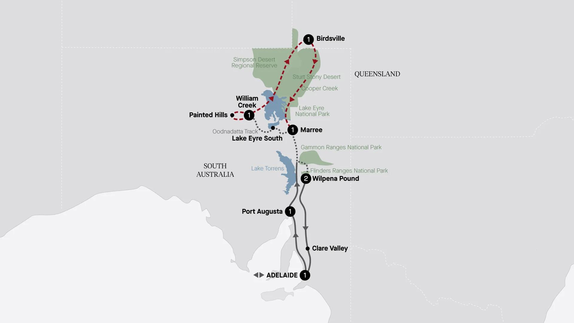 This morning, explore the Historic railway town of Quorn, filled with charming heritage buildings that have been a backdrop for films including Gallipoli and Wolf Creek. Traverse the Pichi Richi Pass, a heritage steam railway line. Stop for lunch at Parachilna’s famous Prairie Hotel, a family-owned pub that was first licensed in 1876. Continue to the stunning Aroona Dam and admire its spectacular ochre-coloured pits, then call in at the ghost town of Farina, once a thriving community with around 600 residents, before arriving at Marree.