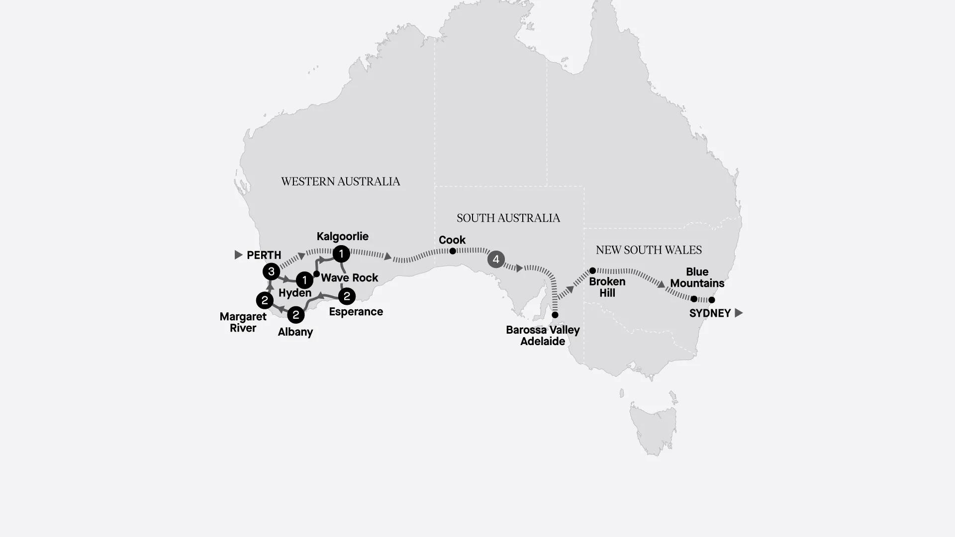 Red wine connoisseurs rejoice as your train glides to South Australia's Barossa Valley, home to the world's oldest continuously producing shiraz, grenache, mataro, cabernet sauvignon and semillon vines. En route, pass the Flinders Range, Spencer Gulf and the Adelaide Plaines before rolling to a stop. The Barossa Valley boasts more than 150 wineries and 80 cellar doors of which you have an abundance of wine tastings to choose from. This evening, indulge in an exclusive wine pairing experience in Seppeltsfield Winery’s vintage cellar. Your chef will serve locally sourced meals, each paired perfectly with a glass of wine. Following dinner, return to the Indian Pacific for the next leg of your trip.