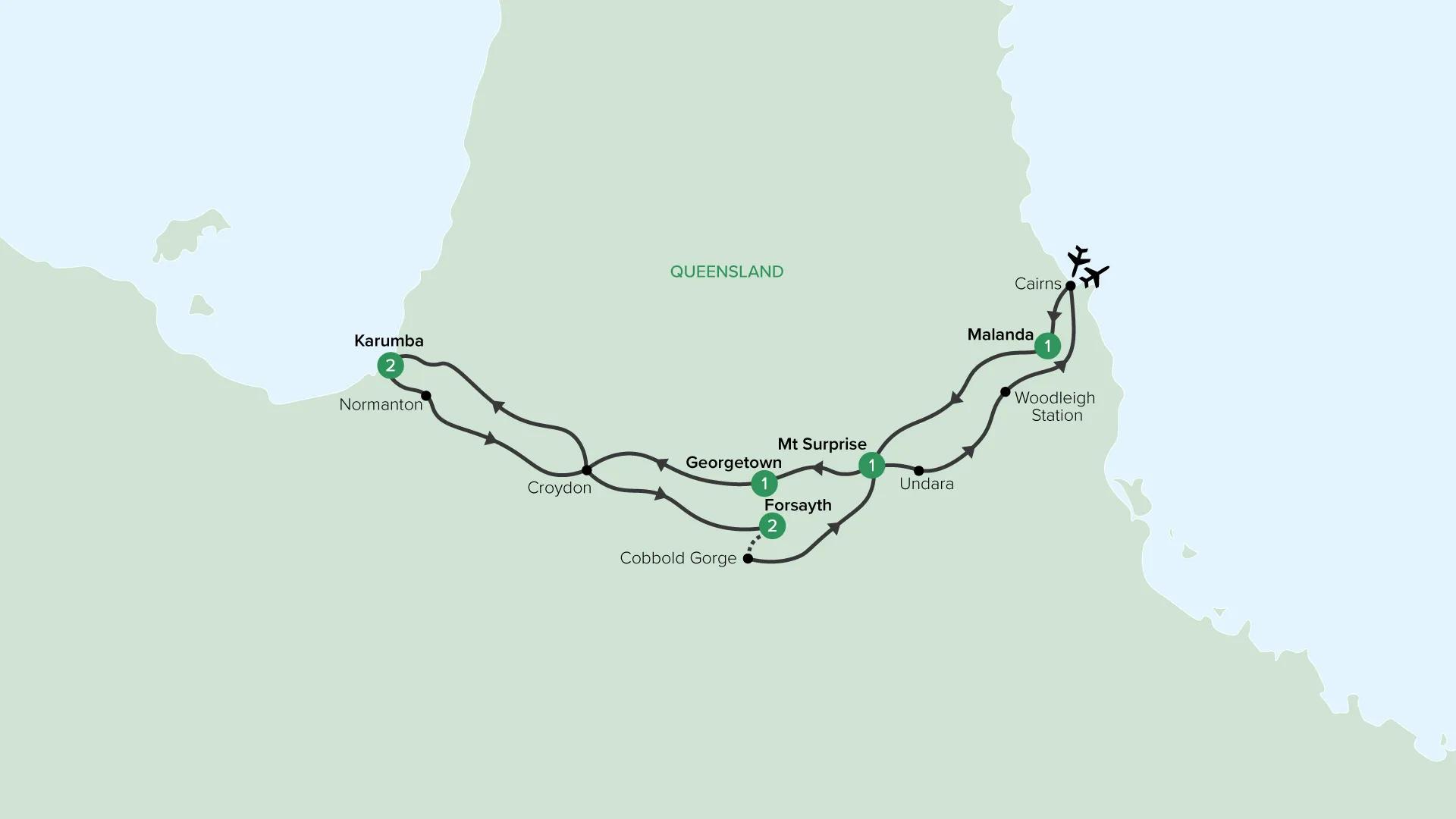 On your return to Cairns, stop for lunch at Woodleigh Station, with its quintessential Australian bush location. Your journey ends on your arrival in Cairns.