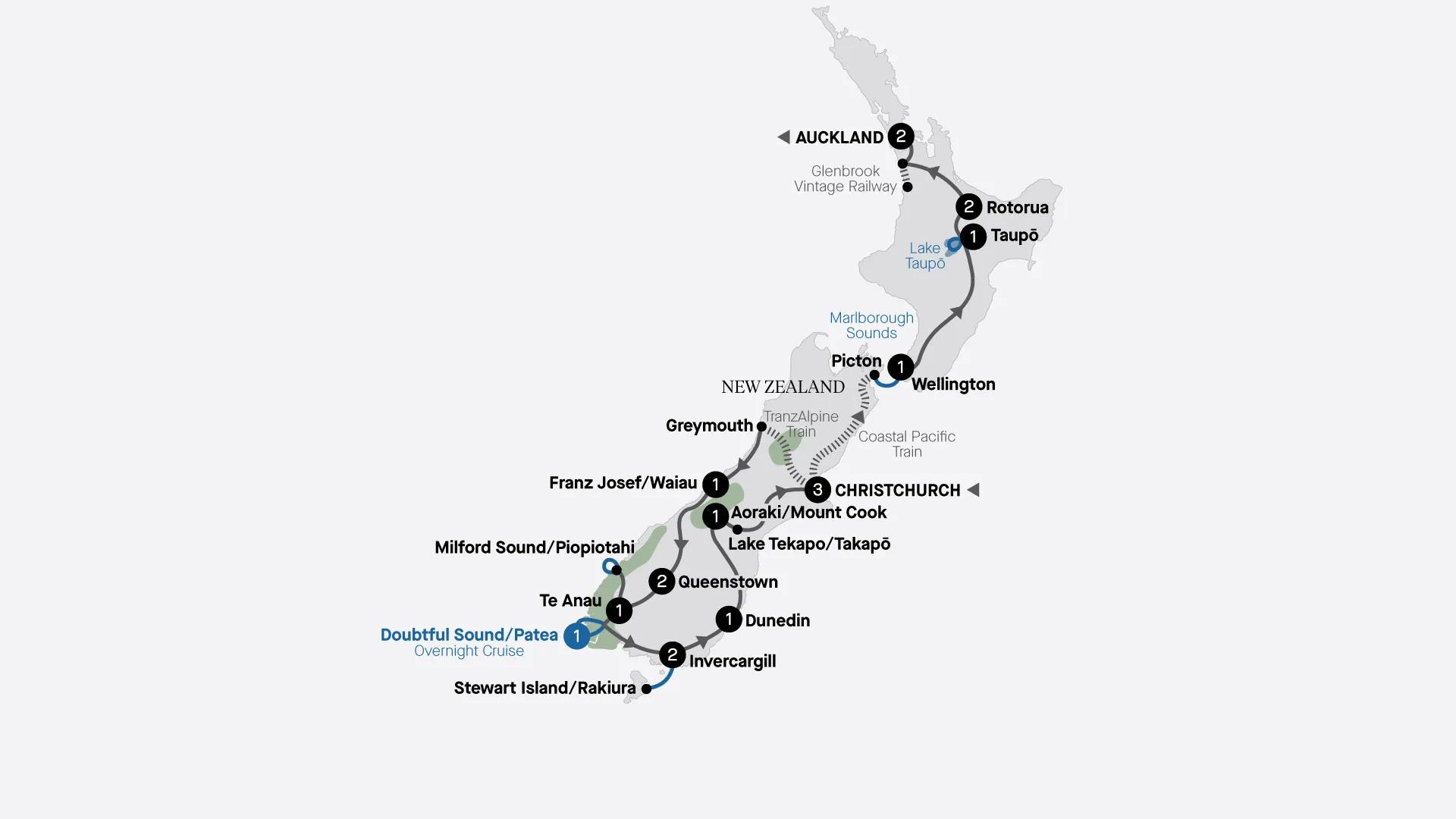 Take the iconic Interislander ferry from Picton on the South Island to Wellington on the North Island. Enjoy stunning views of the Marlborough Sounds before cruising across Cook Strait and into the serene waters of Wellington Harbour.