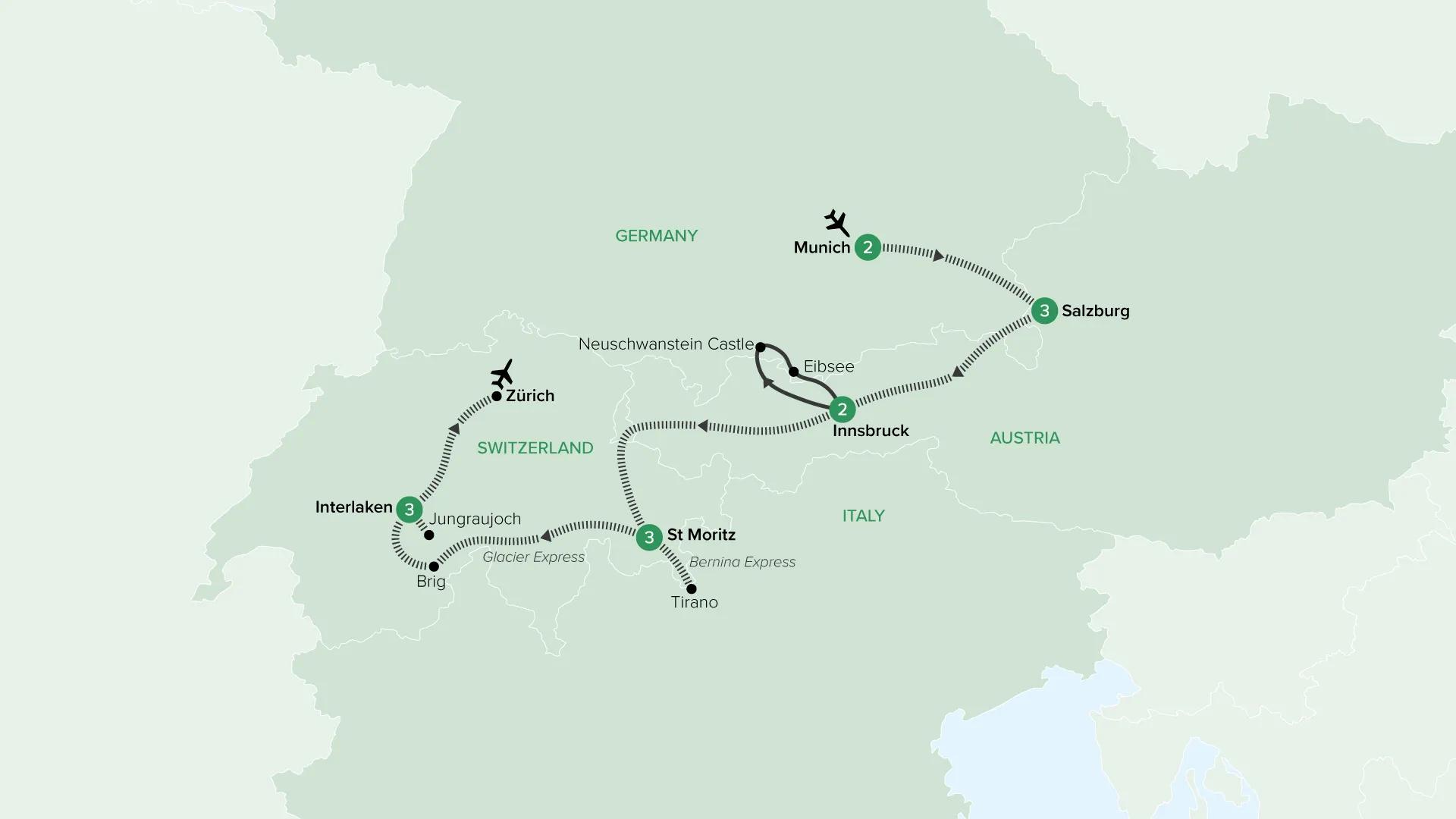 Your incredible journey reaches an end this morning. After breakfast, take the train to the airport in Zurich for your onward flight.