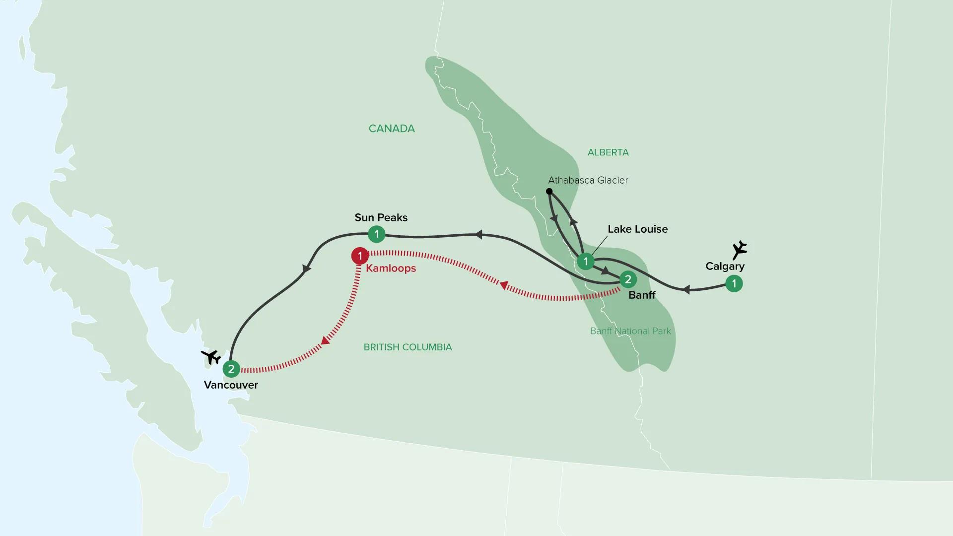 Perhaps replace days five and six with a Rocky Mountaineer rail journey to Vancouver. Board the Rocky Mountaineer and pass the Spiral Tunnels and Kicking Horse Canyon before arriving in Kamloops. Stay in Kamloops at a hotel assigned by Rocky Mountaineer. Additional cost. Enquire for details.