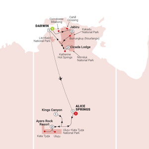 Enjoy breakfast before bidding farewell to Cicada Lodge and setting out for Darwin. Travel to a different corner of Nitmiluk National Park, where the enchanting Leliyn (Edith) Falls beckon. With the opportunity for a refreshing swim (seasonal), immerse yourself in the cool waters of this natural oasis surrounded by cascading waterfalls. As the day progresses travel up the Stuart Highway returning to Darwin. Reflecting on the memories made amidst the stunning landscapes and cultural treasures of the Top End of Northern Territory, cherish the experiences that have filled your heart and soul along this part of your journey.