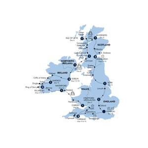 From Rosslare, take the ferry across the Irish Sea to Pembroke and continue with a scenic journey through the rural landscapes of Pembrokeshire. Travel past the valleys of southern Wales to the capital, Cardiff. Enjoy an orientation of the port city on the River Taff, seeing the University of Wales, the Principality Stadium, City Hall and the National Museum.