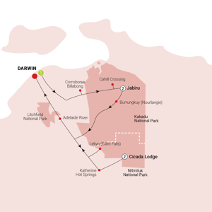 On the final day of this remarkable journey, enjoy breakfast before bidding farewell to Cicada Lodge and setting out for one last adventure. Travel to a different corner of Nitmiluk National Park, where the enchanting Leliyn (Edith) Falls beckon. With the opportunity for a refreshing swim (seasonal) immerse yourself in the cool waters, surrounded by cascading waterfalls of this natural oasis. As the day progresses, travel up the Stuart Highway to Darwin, where your tour ends. Reflecting on the memories made amidst the stunning landscapes and cultural treasures of the Top End of the Northern Territory, cherish the moments you have experienced on this extraordinary journey.