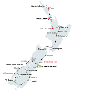 Your New Zealand tour starts on a high as you jump aboard the TranzAlpine train bound for Arthur's Pass, through tunnels and over viaducts with panoramic views of snow-capped peaks, icy rivers, beech forests, gorges and river valleys. From Arthur’s Pass, visit the small town of Hokitika, the heritage and cultural centre of the West Coast well-known for its jade. Things are about to get cool again as you arrive in the town of Franz Josef/Waiau, gateway to Franz Josef Glacier/Ka Roimata o Hine Hukatere, a white-out of snow and ice that shimmers like a gem. Get some perspective on a scenic helicopter flight over this natural wonder – if the weather behaves, you may even get to land on it (own expense).