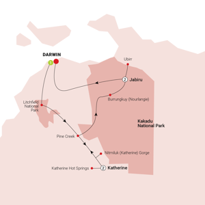 Today is your chance to reset your body’s natural rhythms with a morning dip in Katherine Hot Springs – because days are better when you begin them in thermal waters. These hot springs will have you relaxed in no time. Before venturing deep into Kakadu, you’re poised for refreshments with a short stopover in the film-set-like town of Pine Creek, where buildings date to the heady gold rush days. In Kakadu, you’ll take a guided walk to view ancient Aboriginal rock art at Burrungkuy (Nourlangie).