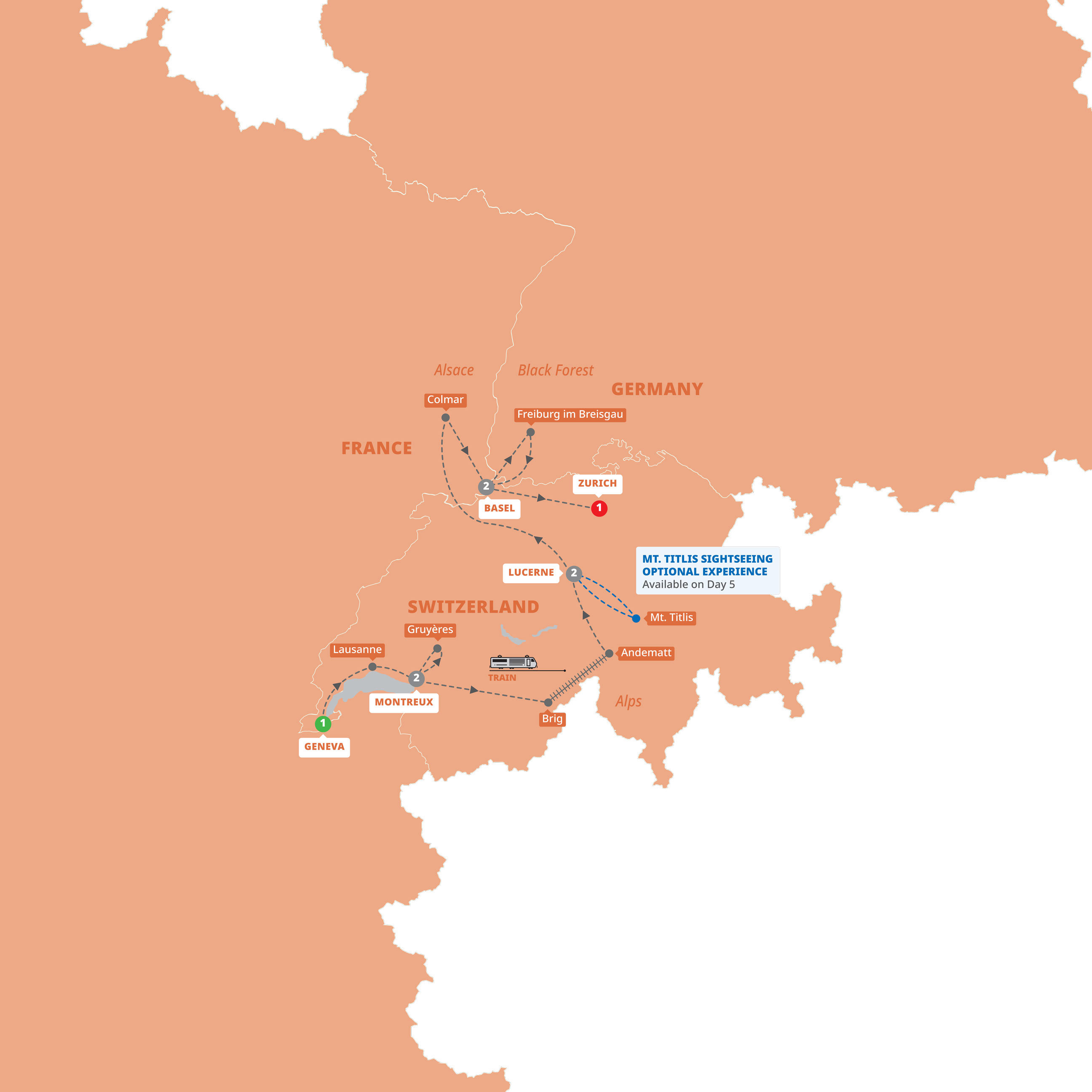 Say a fond farewell to Switzerland and your newfound friends at the end of an unforgettable journey. Your final hotel is located at the airport, just a short walk from the terminal, so there’s no need to arrange a transfer.